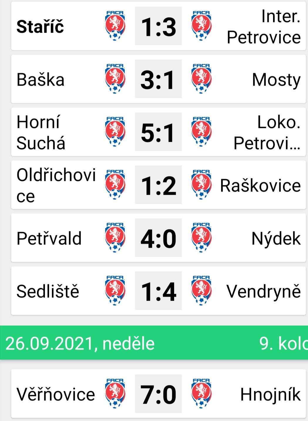 Po dvou domácích vítězstvích ( Lokomotiva Petrovice B 3:1 a Mosty 7:1) přichází druhá porážka ( Petřvald 2:3), v tabulce pravdy díky remíze v Nýdku jsme na -5 a začíná nám už v polovině podzimu boj o záchranu. A to nás teď čeká těžká série , venku Oldřichovice a potom dvakrát doma se soupeři z čela tabulky a to Raškovice a Věřňovice.